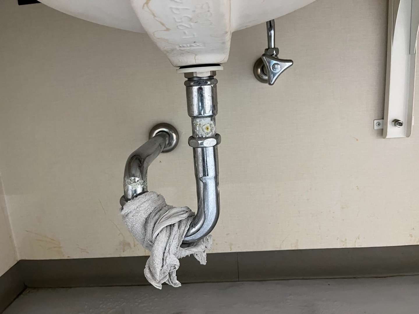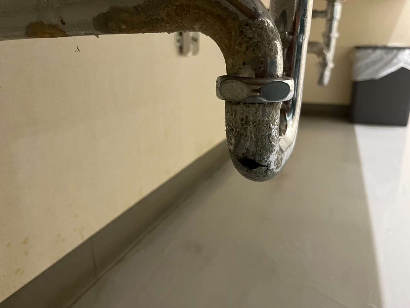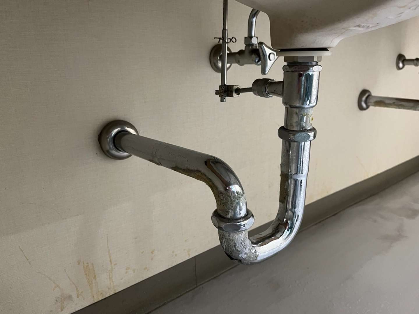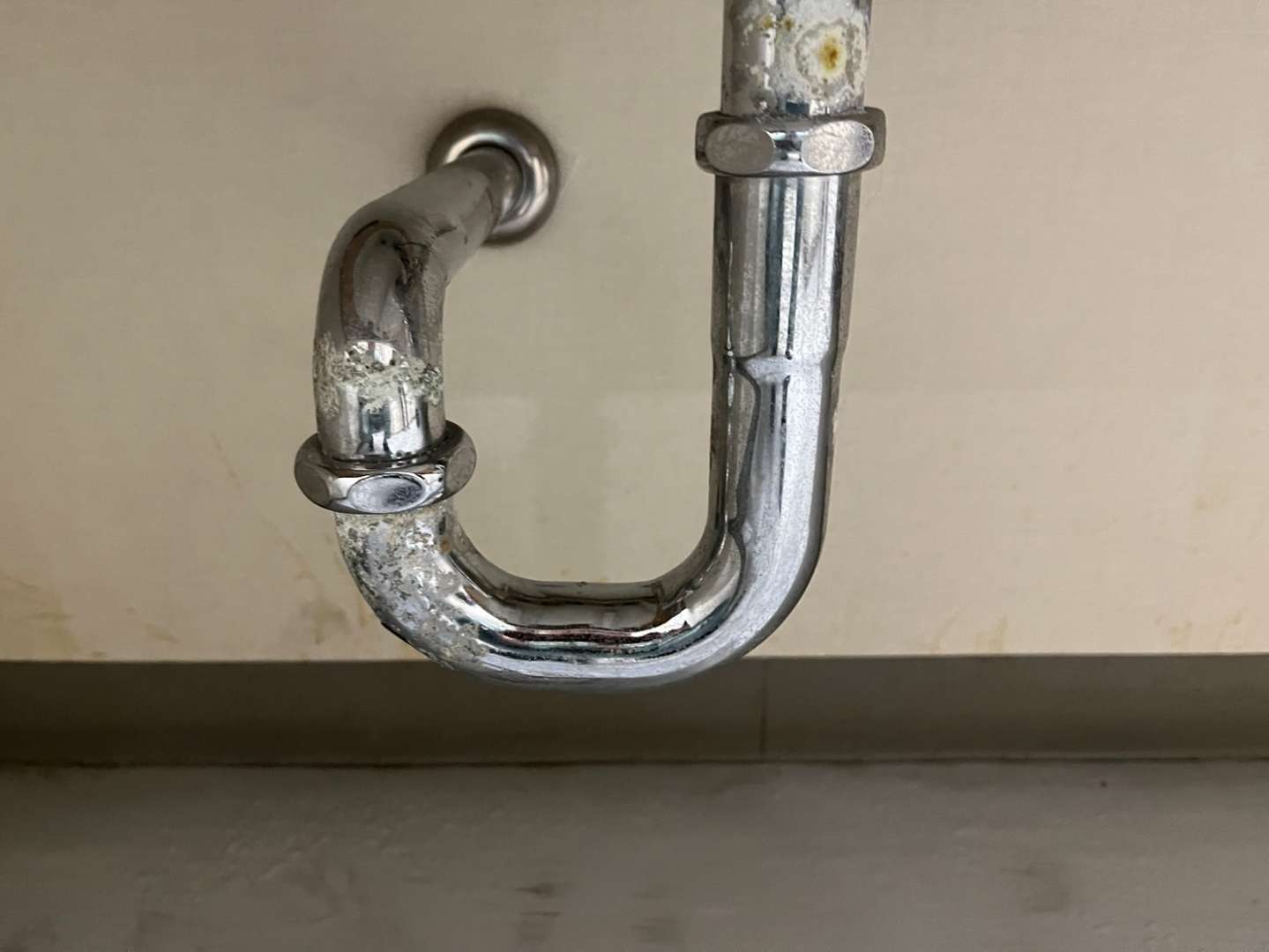 今回は、このトラップ部分が経年劣化やサビによって腐食し、穴が開いてしまっている状態でした。常に水が溜まっている構造であるため、どうしても水質やサビによる劣化が進行しやすい箇所になります。
